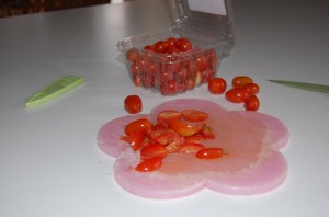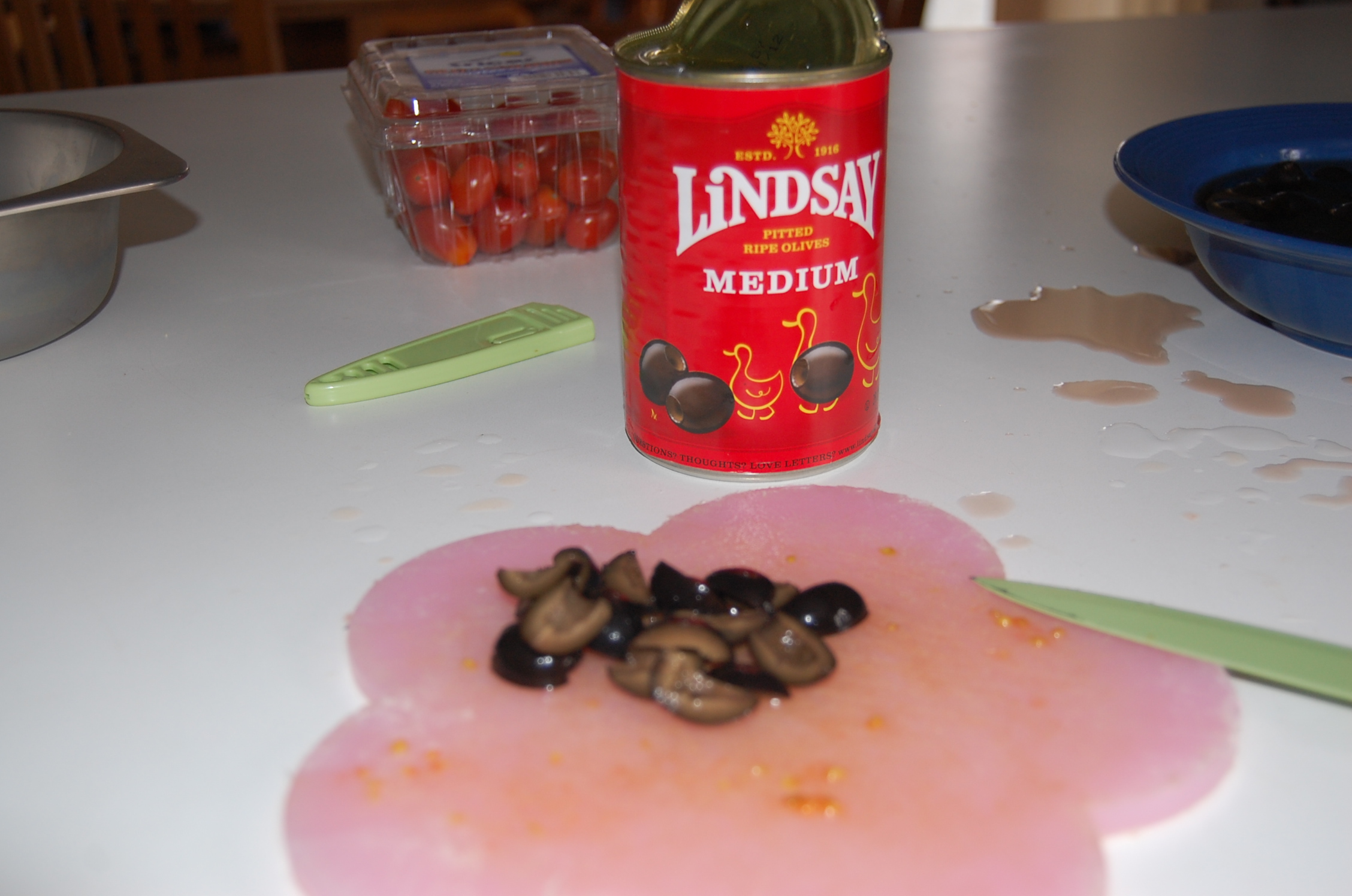 Cut olives into quarters. And for you olive lovers – go ahead and help your self to some while you cut, I know I did!
