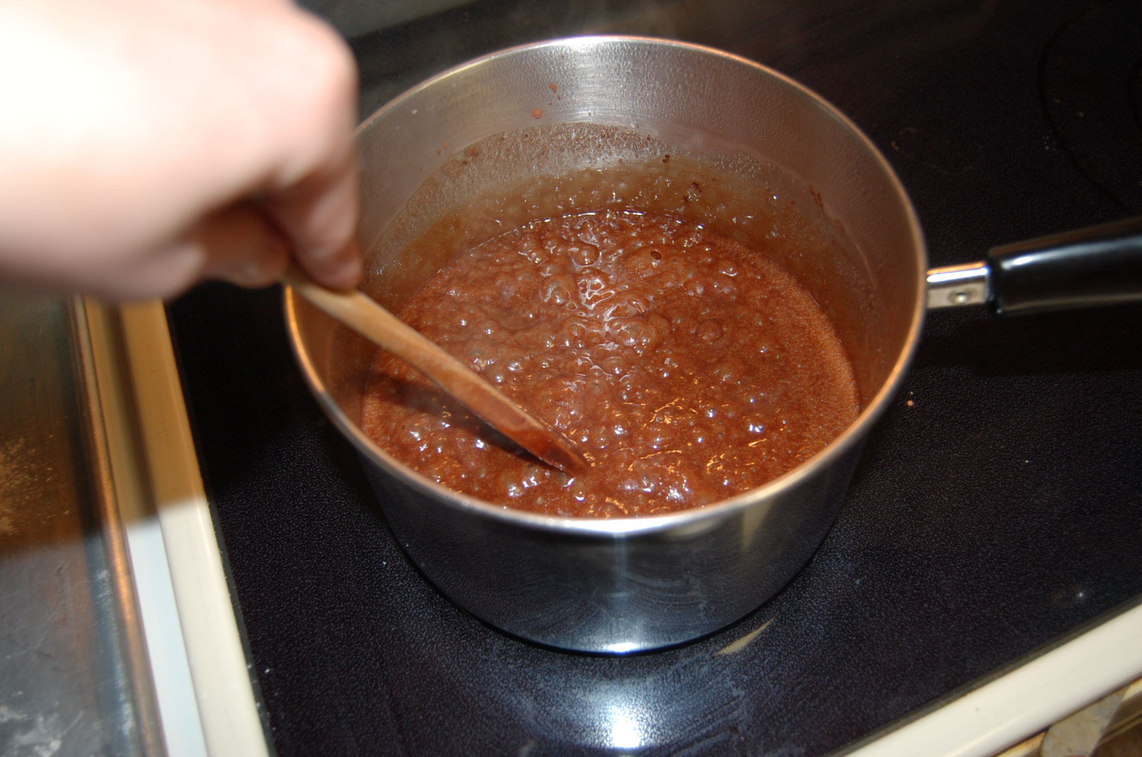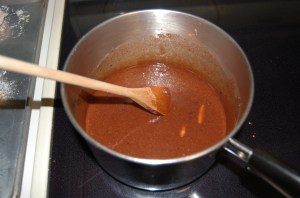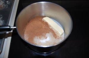 Melt your sugar, butter, milk and cocoa powder.