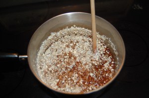 Then add your peanut butter, oatmeal and vanilla. I try to have these ingredients pre-measured and waiting. Mix well.