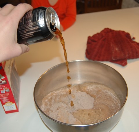 Pour the dry cake into a bowl, adding a teaspoon of cinnamon and the entire can of Diet Coke.