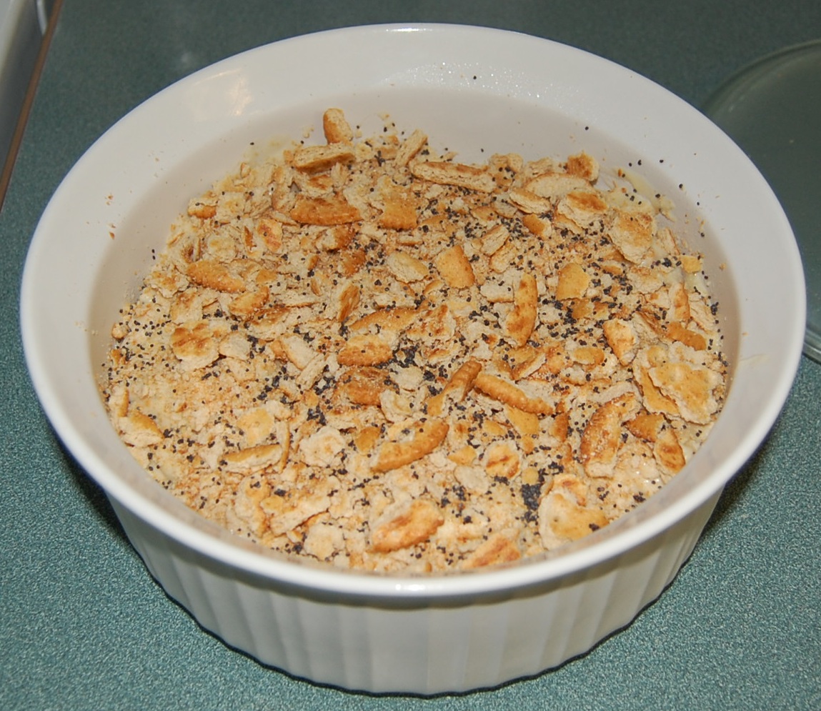 Put your mix in a cooking dish and spread with chopped up Ritz crackers and poppy seeds.