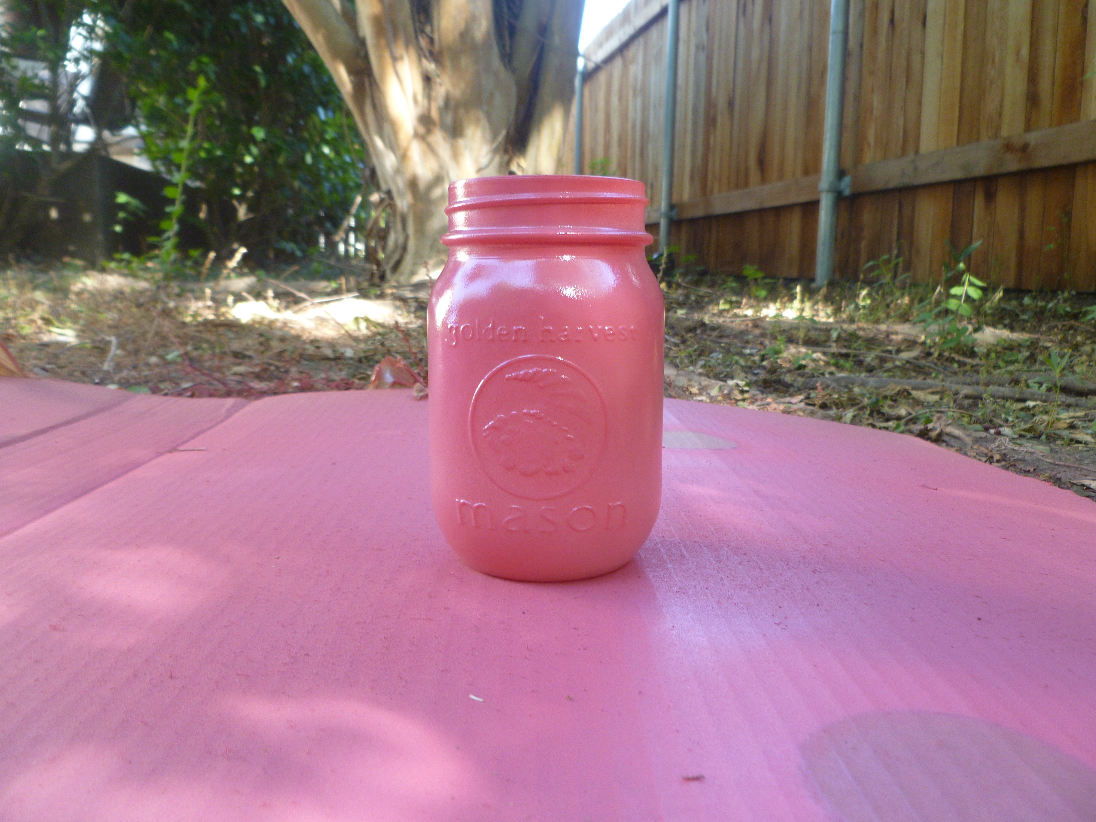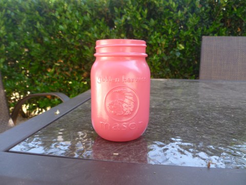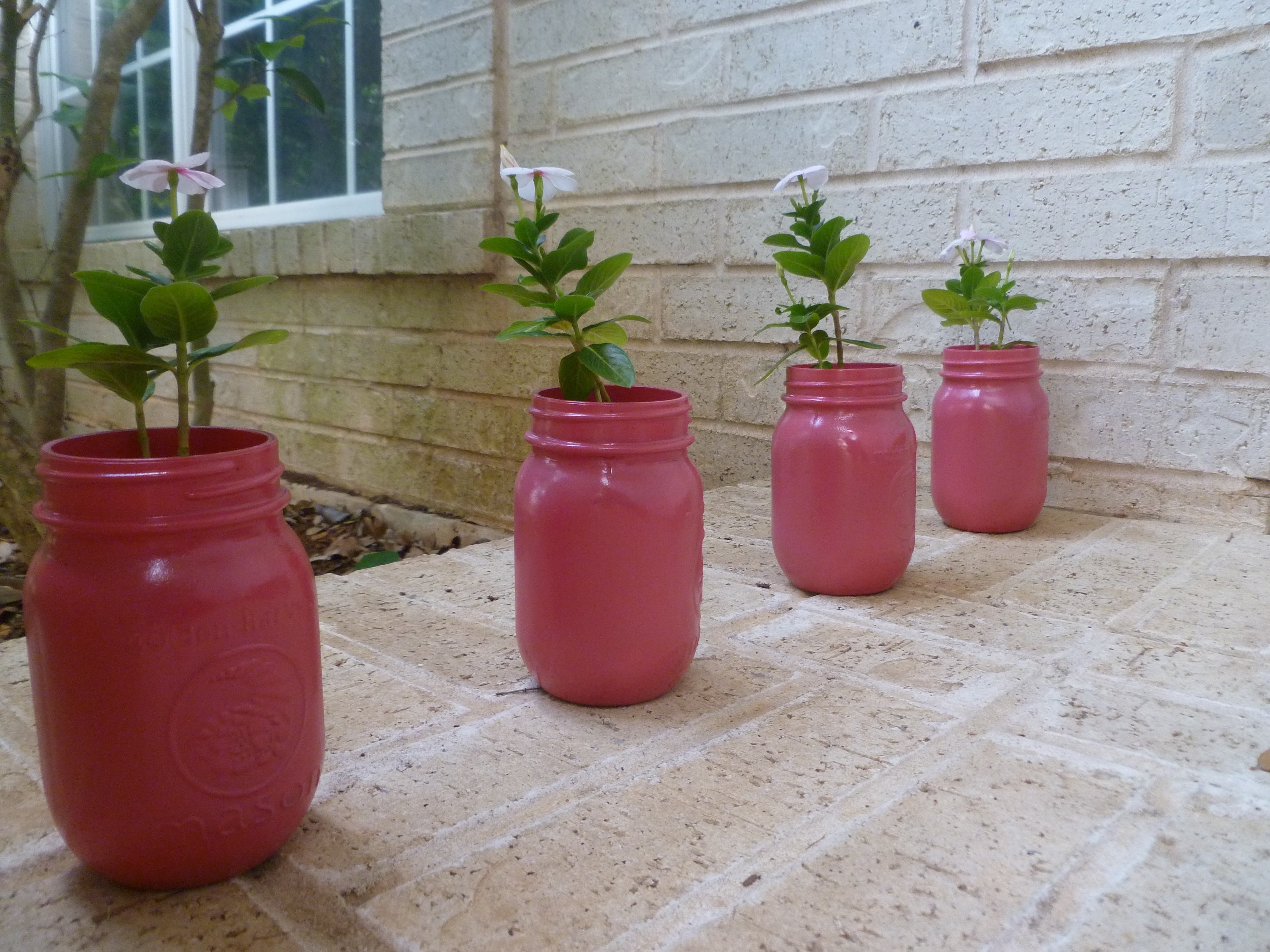 I have an abundance of mason jars that I got off Craigslist last summer. My plans to use them for canning have been postponed, since I need a canner and haven’t found a reasonability priced one yet. I decided that maybe I should use a few of them for crafts instead. A friend sent me a link about spray painting mason jars and using them as flower pots. It was too cute to pass up.