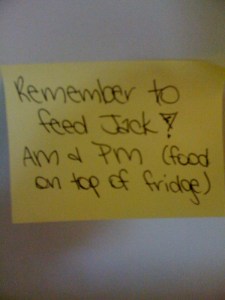 I did this when I traveled to New York. Jonathan said it was helpful {for other things – like coffee}, but the dog never did get fed…