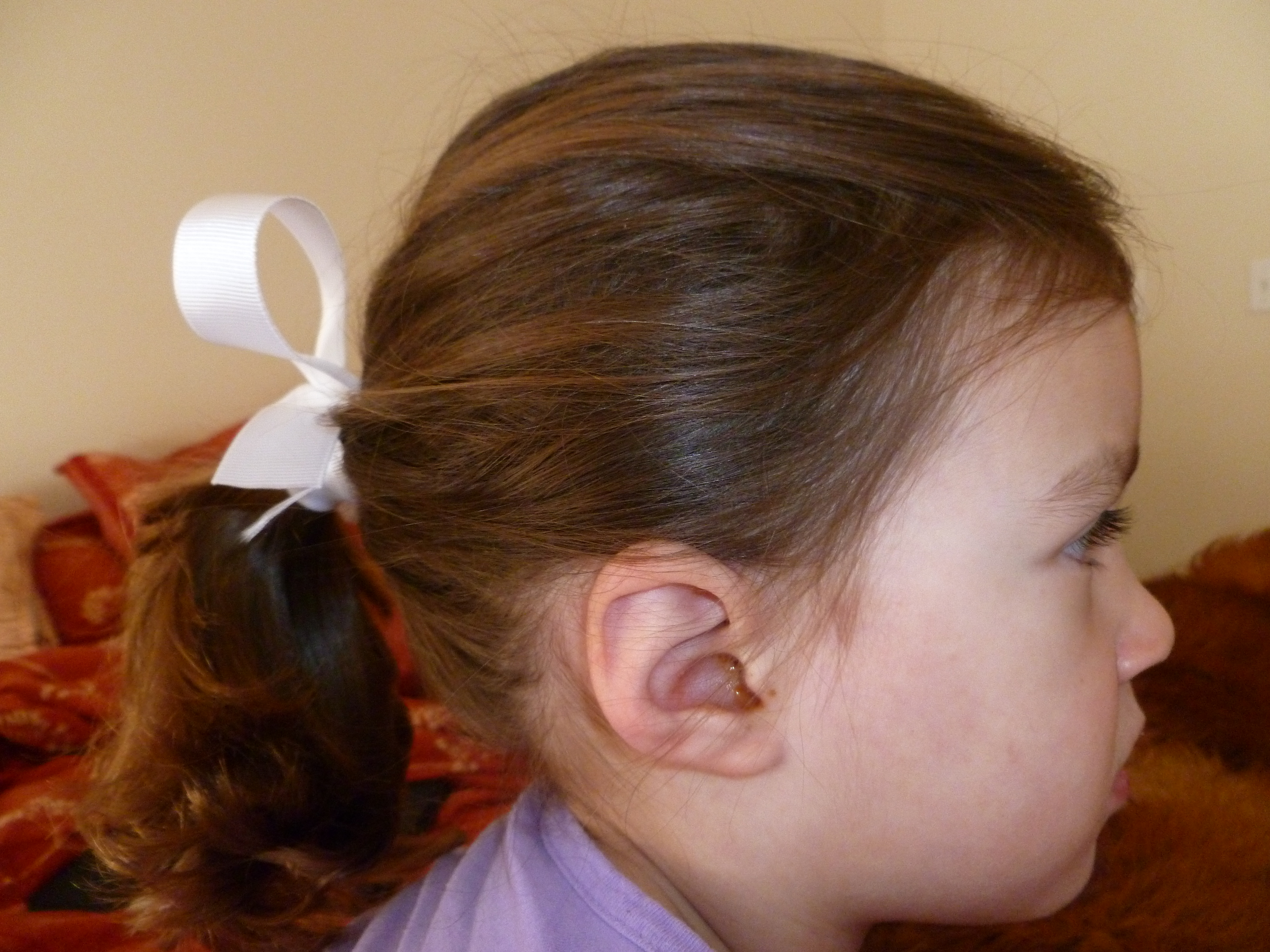 Then, as the genius that I like to think I am, I had a brilliant idea. Julia loves Angelina Ballerina. And Angelina always wears a ribbon in her hair. Well… you can’t have a ribbon in your hair, without a ponytail, now can you? No ma’am, you cannot.
