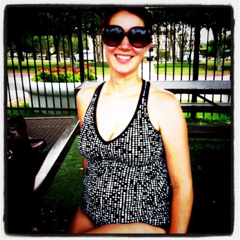 Truth be known, shopping for a swimsuit while pregnant doesn’t quite help with any self-esteem issues you might have. I just had to remind myself that 1) there’s a reason I need this size 2) the reason will be way cute/worth it come November. I decided to stick with something plain-ish that would grow with me and not fall off when the girls grab on to me. After five tries and a coin toss, this is what I went with:
