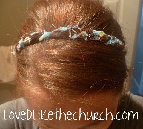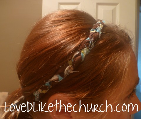 So I went to town. I grabbed three different sheets of scrap fabric and started cutting, braiding and sewing. I decided to only make one band instead of two, because I’ve found that the bigger the headband the less likely it is to stand in my hair.