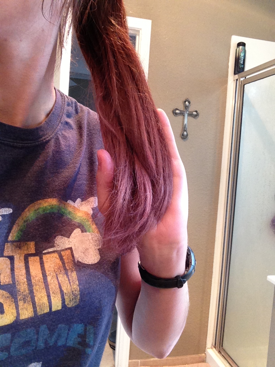 I gave the Pop Pink a try. The directions say to apply to dry hair. I tried that, but frankly had little success. It just made my ends look really dull, not pink. I decided to try it with wet hair. This time the chalk went on smoother, seemed brighter, but once the dust settled, still proved to be more dull than bright.