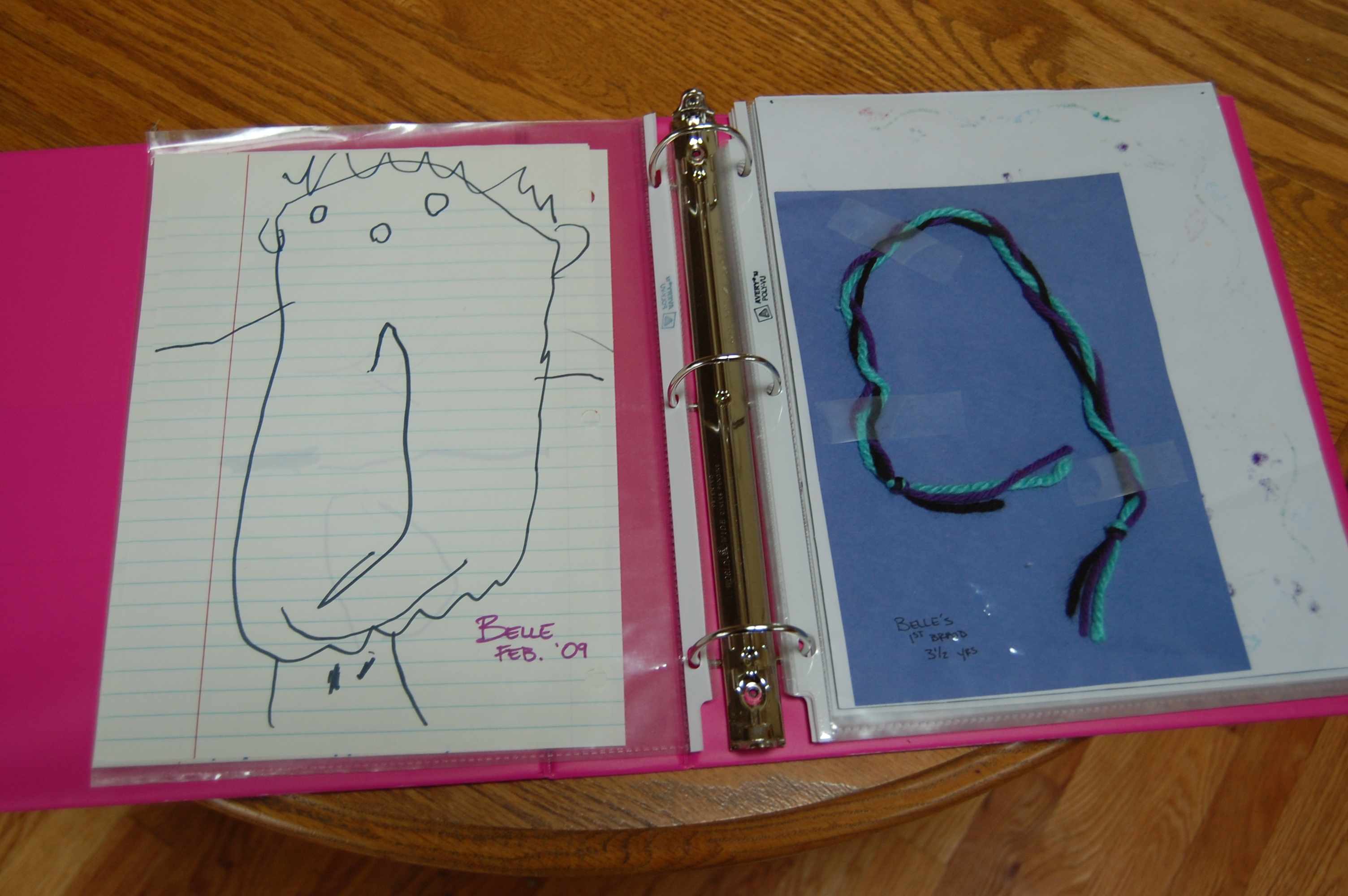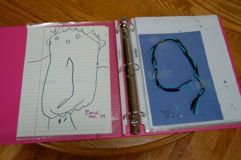 Another idea that I am trying my hand at is having a 3-ring binder with empty plastic sleeves to keep a few of their favorite drawings and/or art projects stored in. My daughter was (and still is) very much into coloring and creating things so I have several of her pieces in there since she was 2 or 3 years old. My son on the other hand? Not so much. He is more into building towers and then knocking them down or chasing his sister. I have a feeling his binder will not be quite as full. 😉