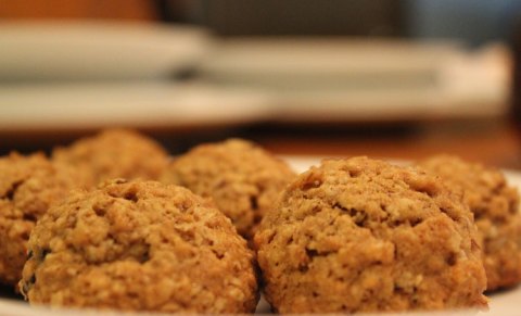 My husband had to make a late run into work, and my assignment was to concoct a filling, yummy, but fairly healthy bedtime snack. I started with a trusted recipe from Smitten Kitchen. She confesses that she actually reduced the sugar when she made the recipe. I reduced it a little more. (And to tell you the truth, when I make them again, I’ll probably reduce it just a little bit more.) Add in whole wheat flour and flaxseed meal, and I had a fairly healthy but sweet-tooth satisfying bedtime snack.