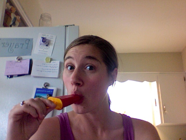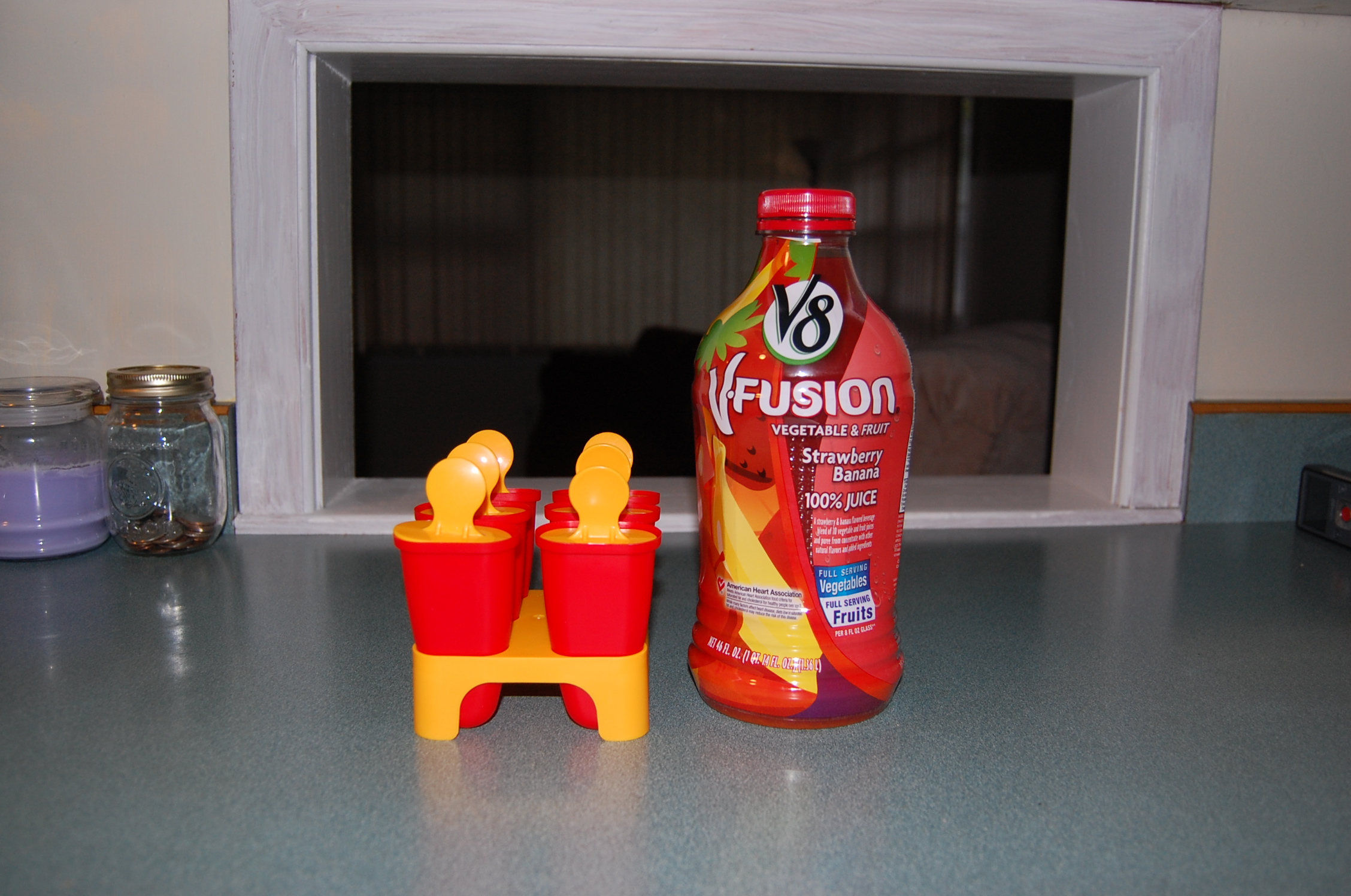 To combat the crazy high temps this week, I made strawberry/banana popsicles. A couple of months ago, we picked up popsicles molds at IKEA for $1. Then at the beginning of this month, I scored V8 Fusion for dirt cheap. {Side note – V8 Fusion is amazing. You get a full serving of fruits and vegetables in every serving of juice. It’s like every mother’s dream come true.}