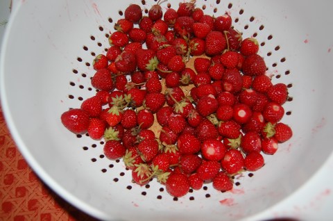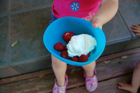 Funny enough, that’s actually only half of what I picked. For every 2 I put in, Julia ate 3. I’m not even joking. Notice the quickly abandoned graham cracker at the bottom of the strainer? I’d given it to her at the beginning as bribe for not eating the berries. It didn’t work.
