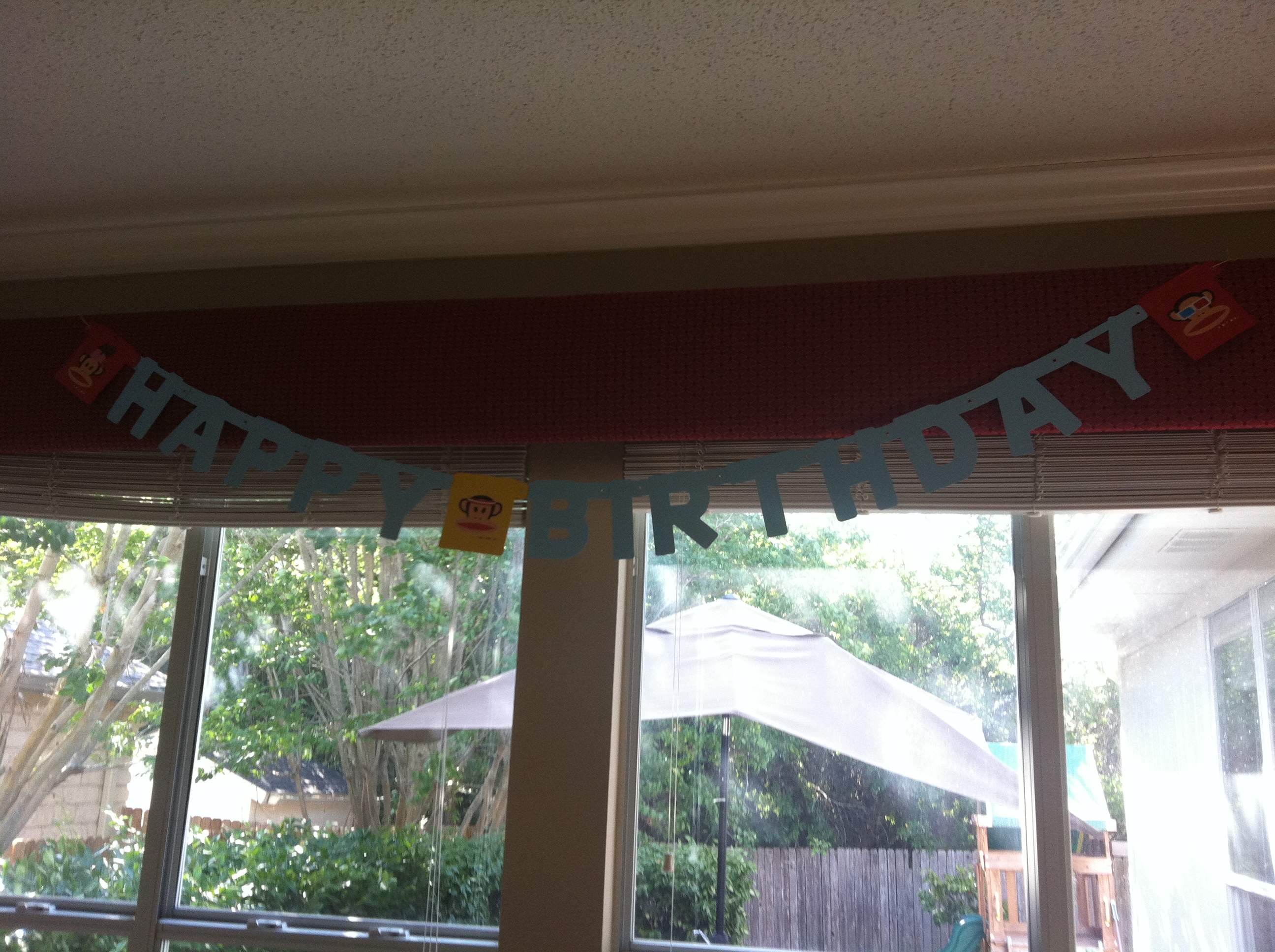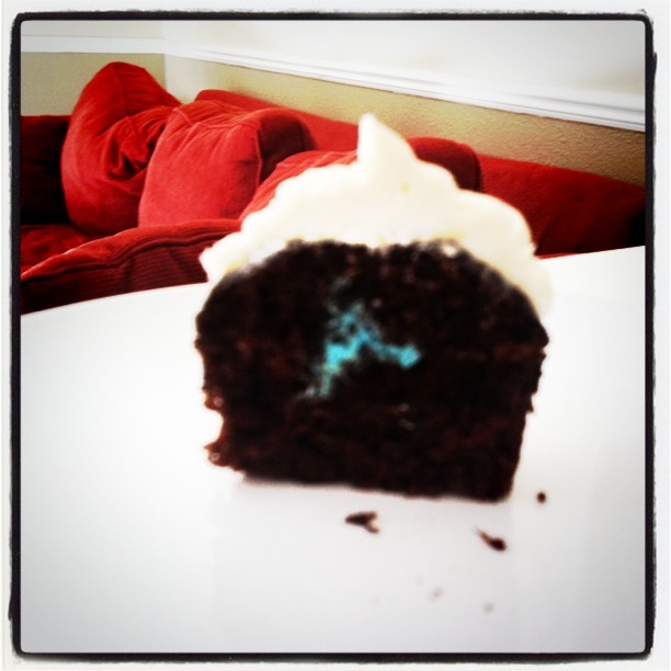 I should mention, these are special cupcakes. Aside from being homemade banana chocolate cupcakes, they actually contain frosting on the inside. And not just any frosting. When our party guests bit into the cupcakes, the frosting inside indicated Baby Three’s gender: