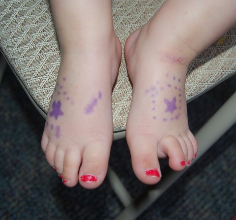 Since getting my newest tattoo, Julia keeps asking me about my “owie”. The first night I told her it was called a tattoo and pointed out my other two to her – hoping to remind her that they aren’t really owies. She wasn’t convinced. Instead, she started calling the owie on her ankle a tattoo: “Daddy, look. My tattoo.” Sweeeet.